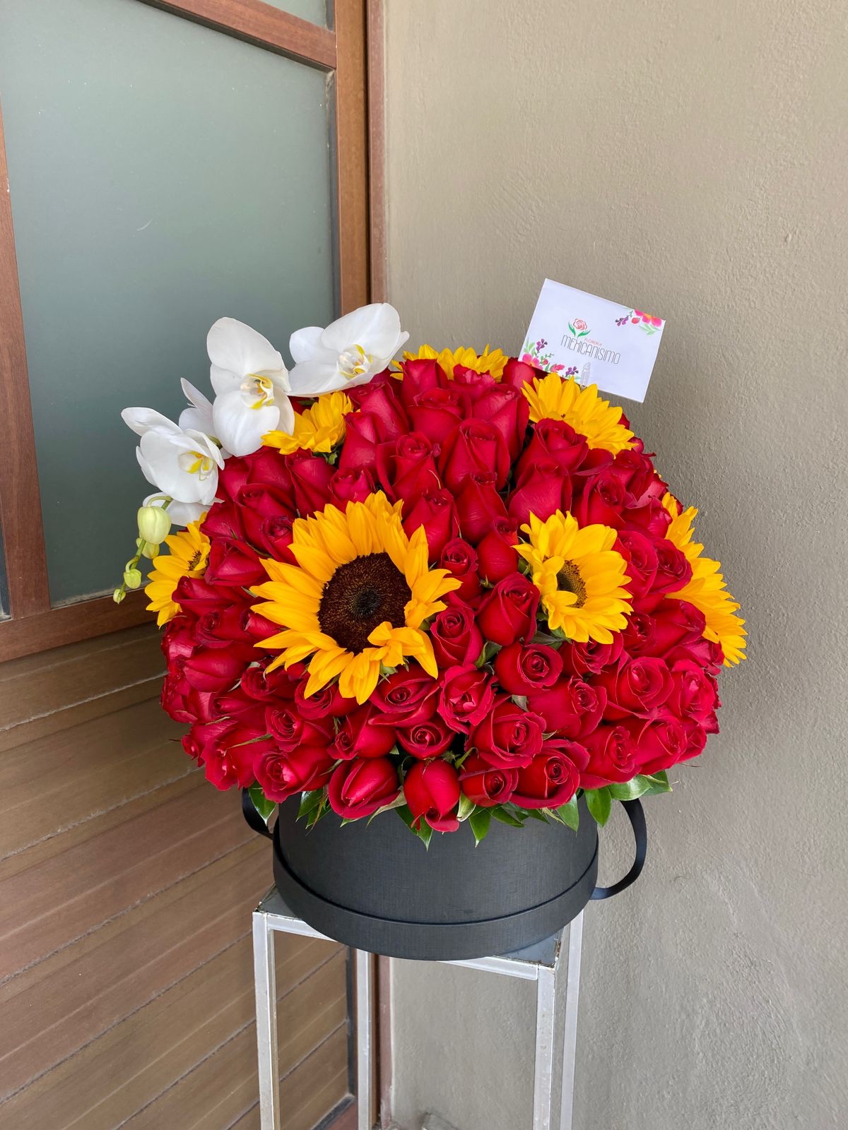 Este audaz arreglo combina la pasión de las rosas rojas con la alegría de los girasoles, creando una composición llena de energía y vitalidad. Los toques de orquídeas blancas añaden un toque de elegancia y sofisticación. Presentado en una caja negra elegante, este arreglo es perfecto para celebrar momentos especiales con un toque de originalidad y audacia.