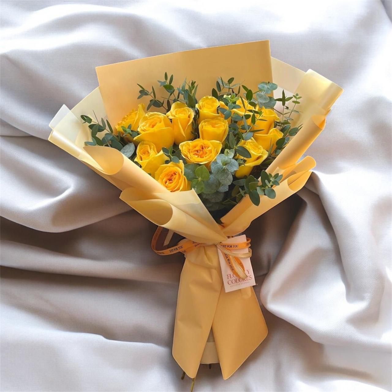 Este radiante arreglo presenta rosas amarillas vibrantes, elegantemente combinadas con toques de eucalipto fresco. Envuelto en papel a juego y atado con una cinta delicada, este ramo transmite calidez, alegría y amistad. Perfecto para iluminar cualquier espacio y celebrar momentos especiales con un toque de optimismo.