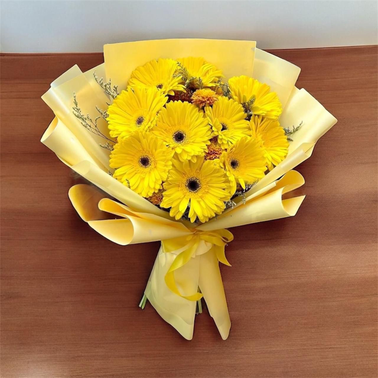 Este arreglo presenta gerberas amarillas brillantes con centros oscuros, envueltas en papel decorativo amarillo que complementa el color de las flores. Un lazo amarillo asegura el envoltorio, dando un toque final cohesivo. El estilo es moderno y alegre, ideal para iluminar cualquier espacio o como un regalo para transmitir alegría y optimismo.