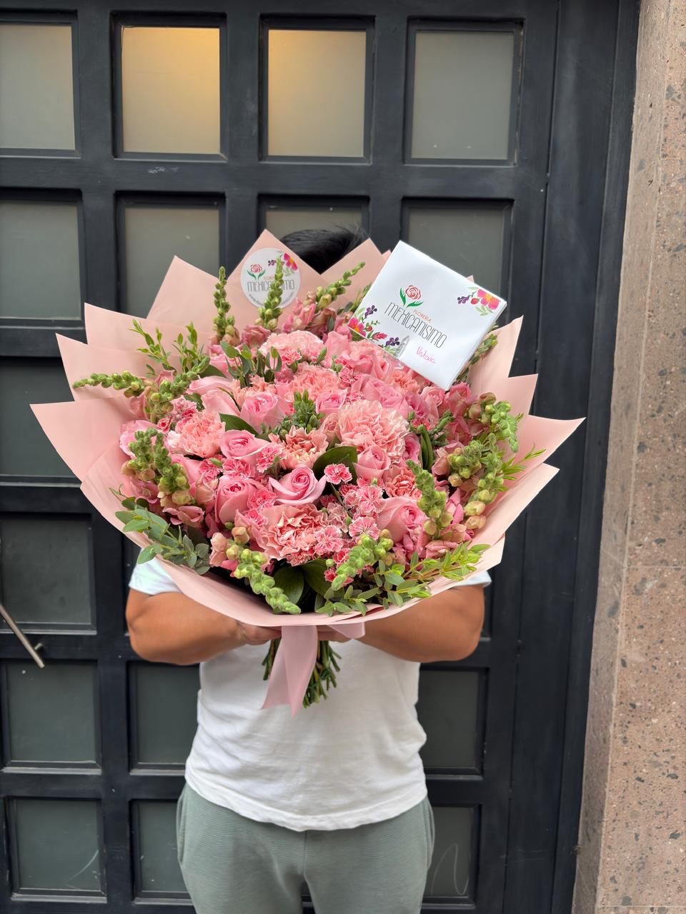 Este delicado arreglo presenta una suave combinación de rosas rosadas, claveles rosados y flores complementarias en tonos pastel. Los toques de vegetación fresca realzan la belleza de las flores, mientras que el envoltorio rosa suave añade un toque de ternura. Ideal para expresar cariño, celebrar la amistad o simplemente alegrar el día de alguien especial.